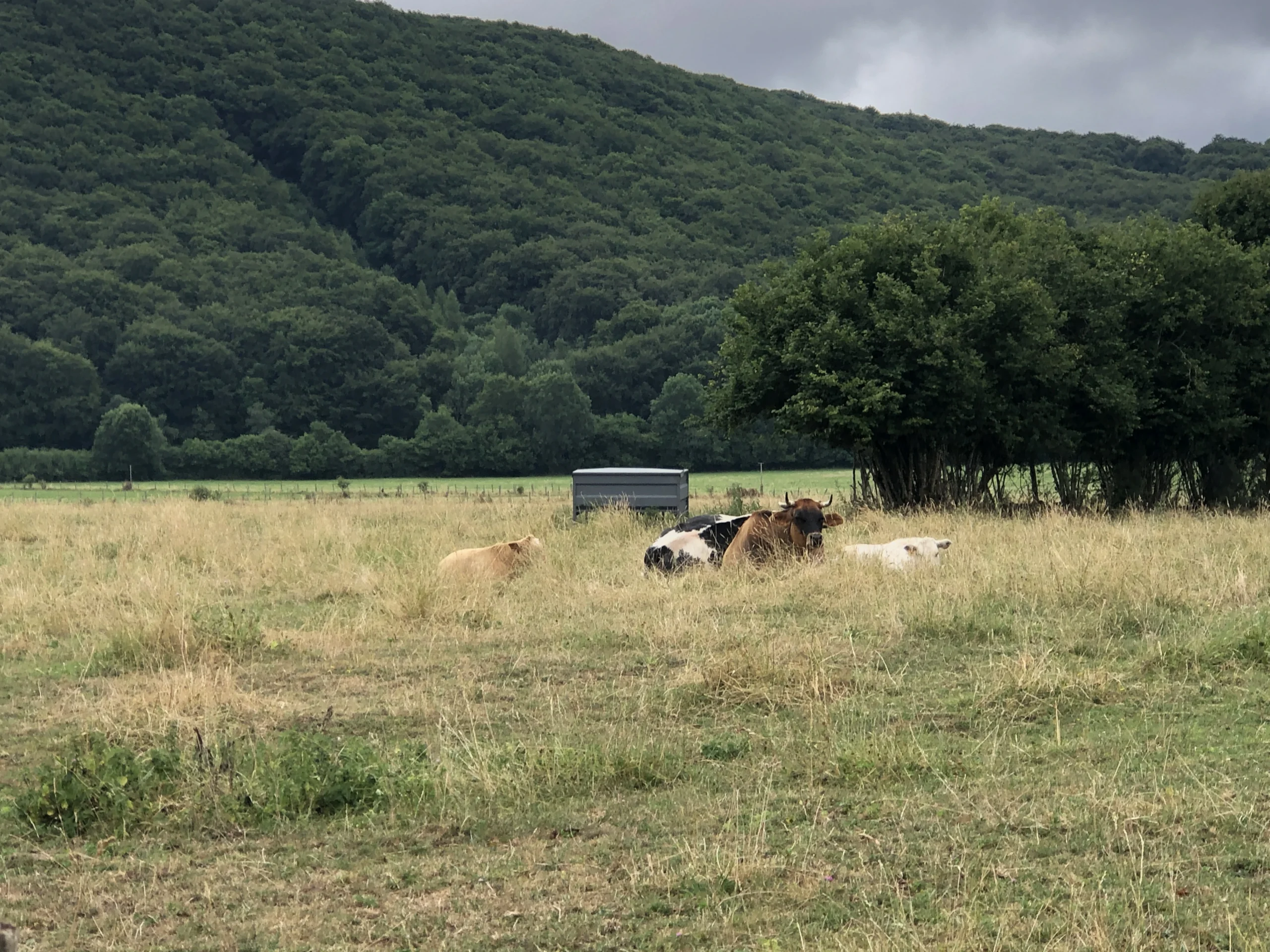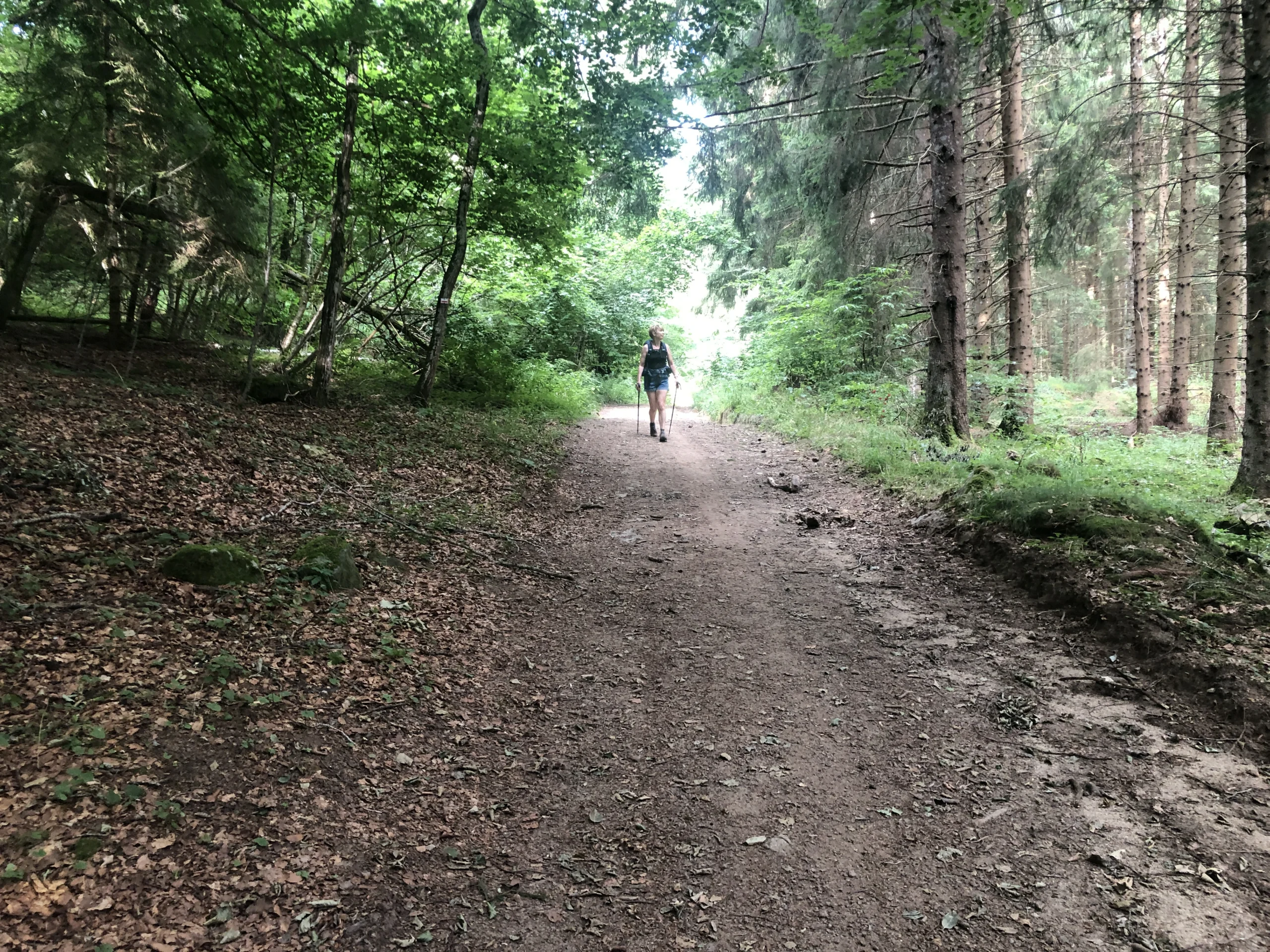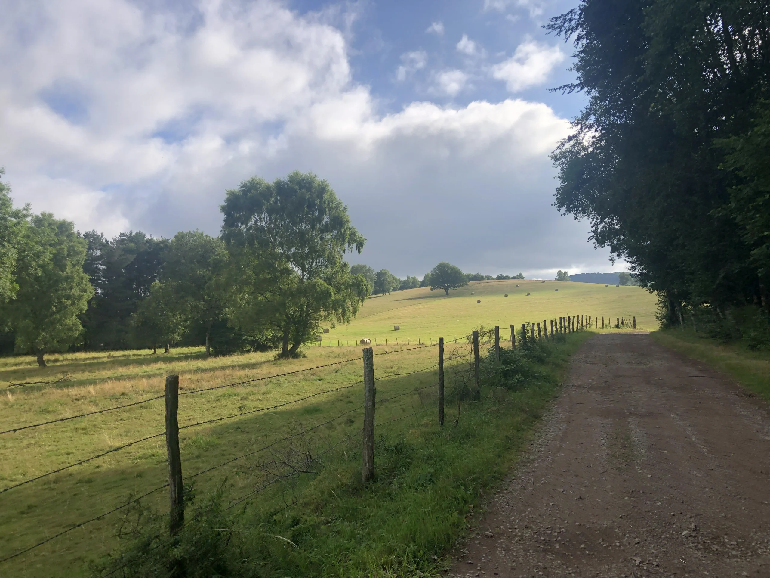 On quitte l’hébergement par la route afin de rejoindre le GR 441 qui passe à 2 pas. Le sentier alterne entre chemins de campagne et passages en lisière de forêt.