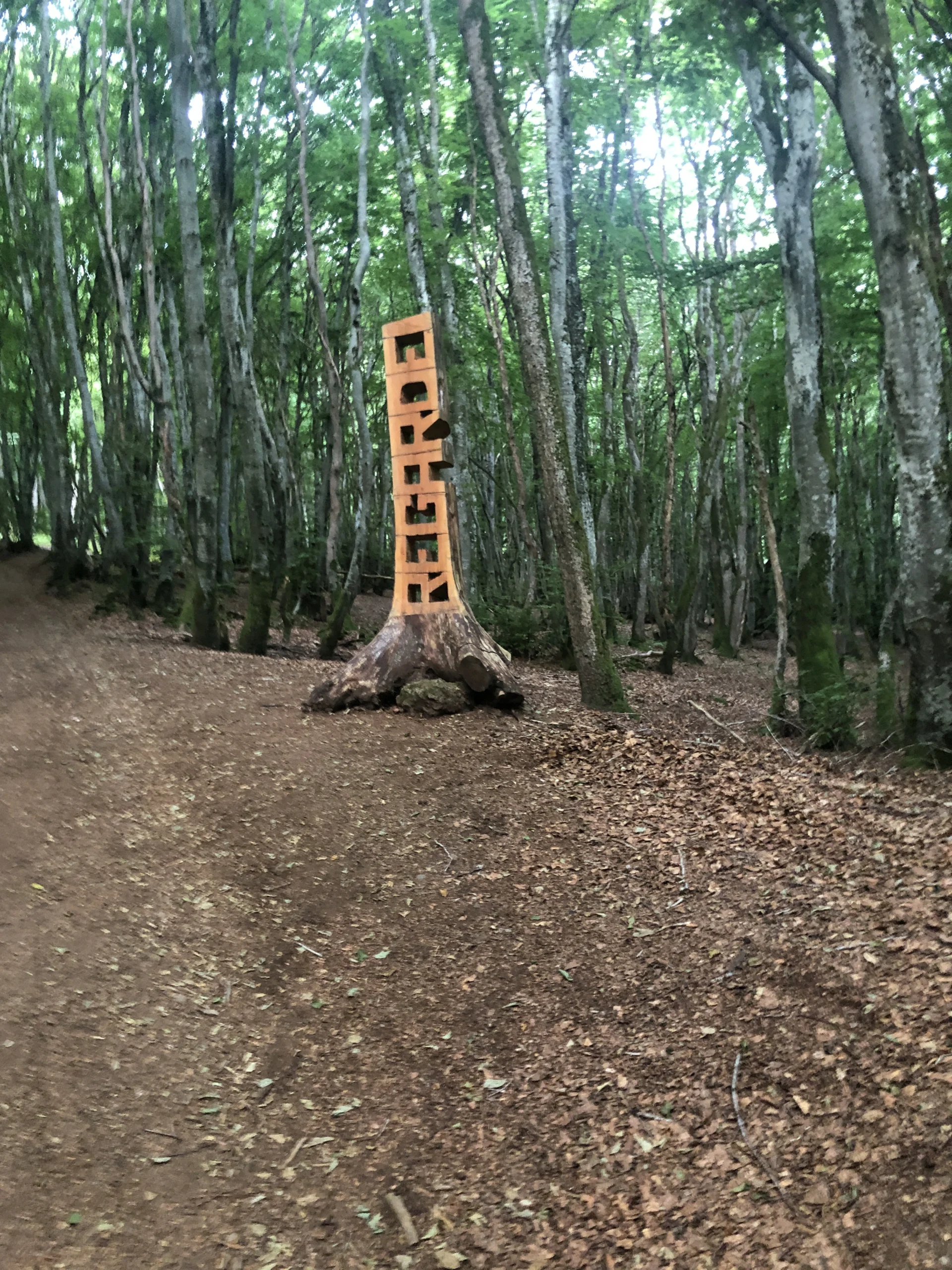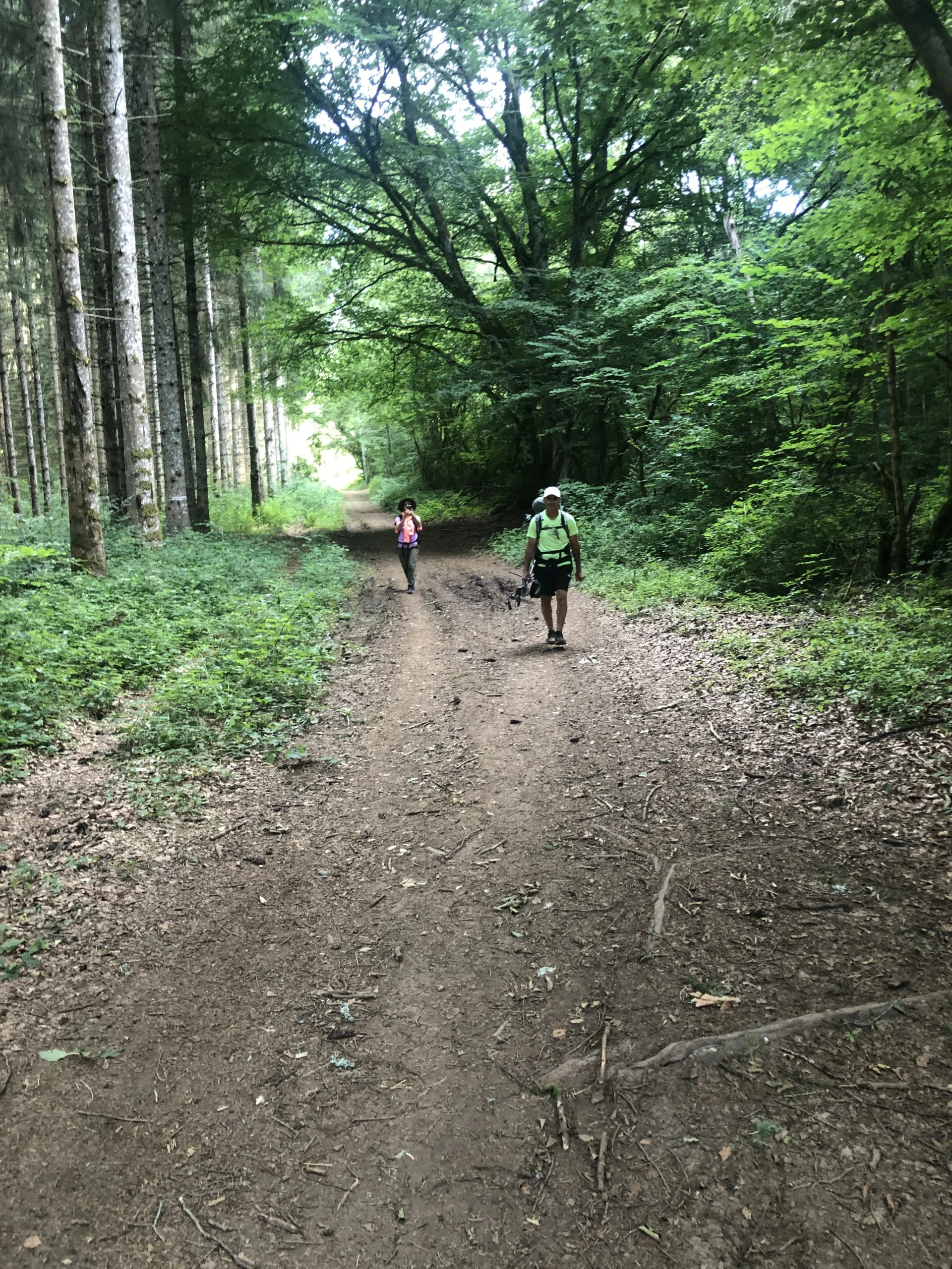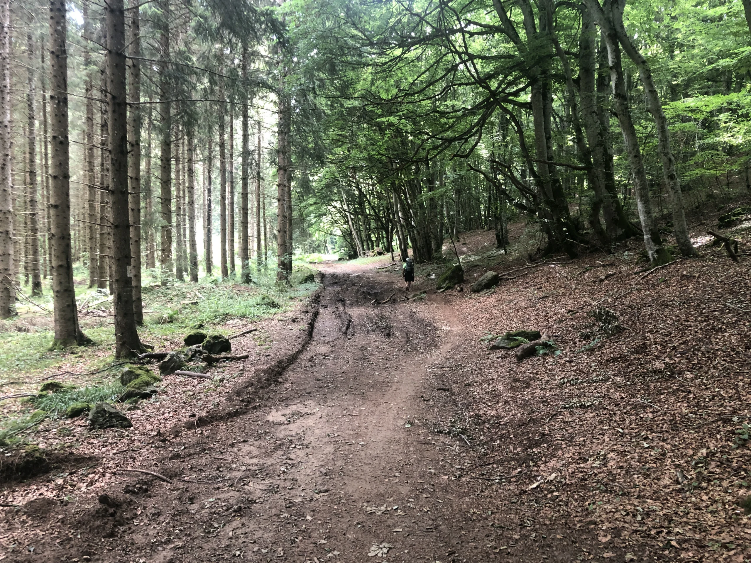 On quitte l’hébergement par la route afin de rejoindre le GR 441 qui passe à 2 pas. Le sentier alterne entre chemins de campagne et passages en lisière de forêt.